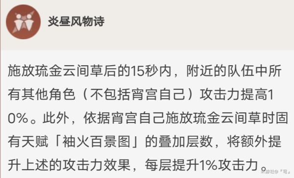 宵宫通过站场小技能,叠加第一被动,之后开大触发第二被动,为全队除自身外提供20%攻击力加成,弥补自身下场的伤害丢失。