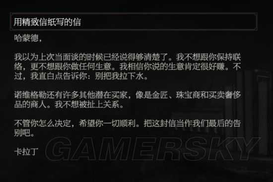 这封信里提到的生意,应该是销赃,因为涉及金匠,珠宝商之类的。看样子是哈蒙德想找卡拉丁帮忙销赃但是被拒绝了,而且卡拉丁似乎不希望再跟哈蒙德有联系。这封信是很多玩家判断卡拉丁已经从良的最主要证据,但和哈蒙德刚才表现出的态度有很大的冲突。如果他们俩之间很早就已经断了联系,为什么白狼一问到卡拉丁,哈蒙德反应会这么激烈,还会联想到生意得罪了人呢?另外,信里的内容只涉及到销赃,并没有人口买卖也让我有点疑惑,毕竟人口买卖的赚头更大,相比之下销赃只是小生意。同时,信纸很精致而且哈蒙德随身携带,也说明这封信是最近才寄给哈蒙德的,换句话说卡拉丁金盆洗手的想法应该也是最近才有的。
