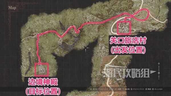 解答第一阶段斯芬克斯的五个谜题后,斯芬克斯会飞走,然后出现在边境神殿。与山岳神殿一样依然建议从关口旅店村出发,按照下图所示路线前往。