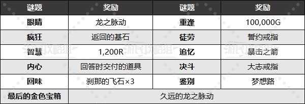 每正确回答一个谜题都可以获得奖励。斯芬克斯总共有10个谜题,每个谜题都有奖励,奖励就在斯芬克斯身后的宝箱中,答对了不要忘记去开。