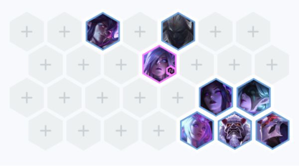 有转夜幽烬可以先追3星锤石和瑞文。没有转夜幽烬也没关系,在瑞文2星以后装备齐全基本不会掉血,攒50块钱利息上8人口找丽丽娅,时光替换蜘蛛组成双秘书,站位如下。