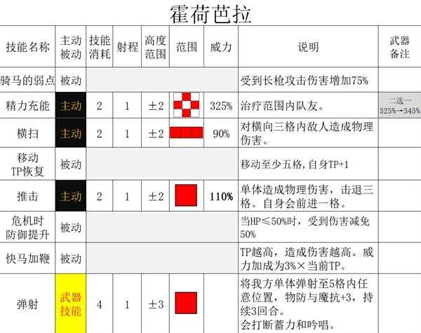 霍荷芭拉的力量与魔力都有用处,力量用于伤害技能的加成,魔力则用于治疗魔法的加成。本身幸运不低,移动能力较为出色。但血量和双抗作为近战来说,只能称作中规中矩,加上自身骑马的弱点,使得她并不能作为肉盾使用。