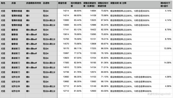 3. 计算中假设尤菈的物理伤害覆盖率为90%,如果覆盖率为80%,期望伤害会低4%(满精螭骨)~6%(松籁、雪葬银星)左右,但基本不影响武器排名和结论