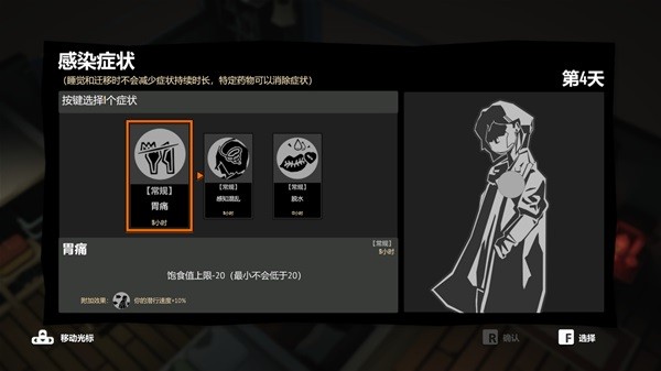 此外从第5天开始,母亲被咬的后遗症开始出现,每天上午醒来时需要从3种病症中选择一种,好消息在于这些病症都是优缺点并存,比如胃痛会降低20点饱食度上限(暂时),但是增加10%潜行速度;脱水会在口渴度泛红时扣体力,但是背包中每有一个空格都会增加速度。