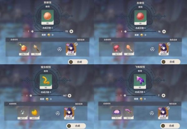 3)鱼饵获取方式:果酿饵直接可以在各地合成台合成,其他的鱼饵需要到蒙德的钓鱼协会npc“楠塔克”处兑换鱼饵配方,每个配方需要花鳉*3,全部兑换需要花鳉*9!