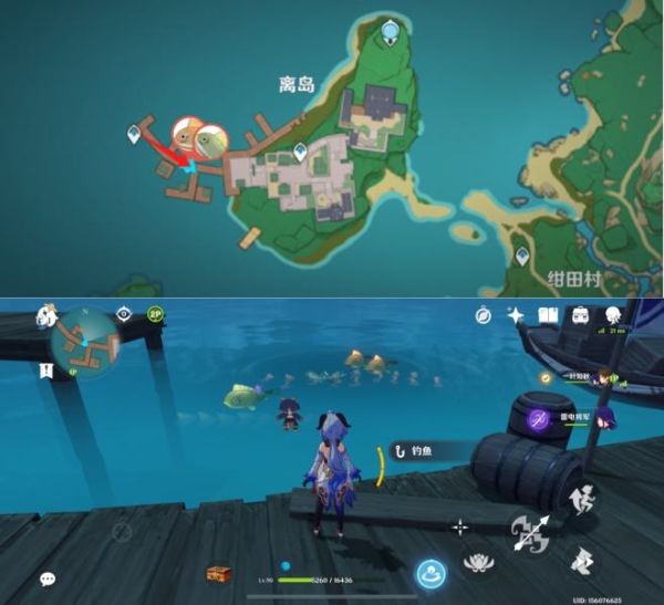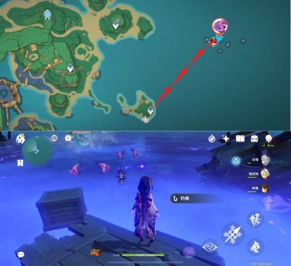 13)从如图点位开船前往核废水处,可以钓雷鸣仙,附近有怪容易拉到仇恨(只在晚上出现)