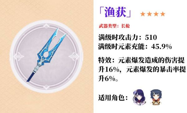 ①元素爆发期间内的暴击率提升12%,可减少圣遗物对暴击率的需要,进一步提升元素充能或暴击伤害等属性,不管是元素充能的提升还是大招的伤害加成相对于其他四星武器来说对雷神和香菱较为契合,可作为四星首选武器!