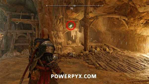 用长矛炸掉一些瓦砾后,沿着小路走到尽头,抬头往上看,跳到对面。沿着一条金链子爬下去,进入隔壁房间,击败敌人后进入房间后面的小隧道,来到一个有红色宝箱的房间,从右侧大门出来,渡鸦就在前面。