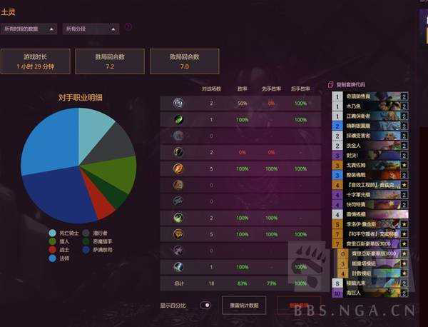 新版本前也是用这套,9星钻10到钻5一局没输,到钻5停了,想着新版本玩玩新套路,结果全是元素法,加入了又都是无聊内战。一气之下拿出这套,居然出奇的好用。环境都挺好打的,就输1把DK是两张线缕全在手,2把蛋猎中有一把自己错斩。