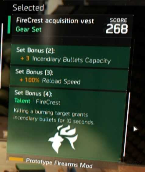 4件加成:杀死一个处于燃烧中的目标可使枪在接下来10秒内带有燃烧子弹效果