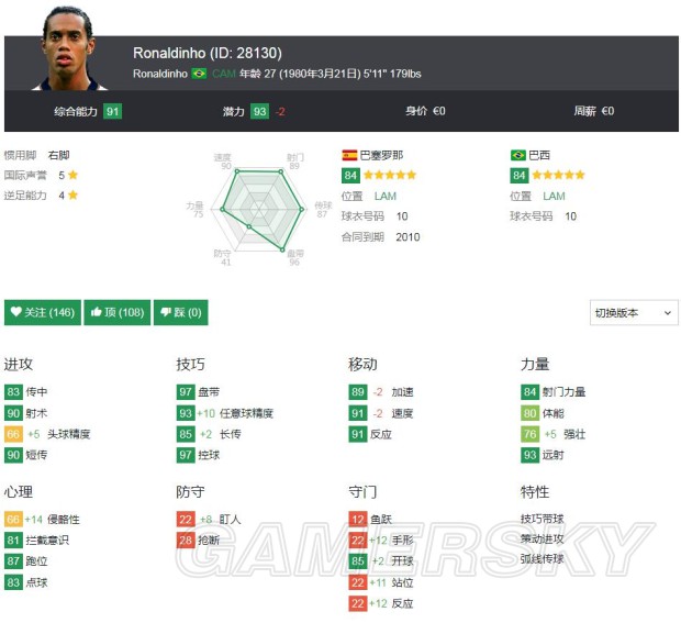 北京时间2018年1月17日凌晨,一代巴西足球巨星小罗宣布退役,一代大师同足坛挥手告别,走进记忆的深处。下面就为大家盘点一下《FIFA》游戏中小罗的历代数据,一起来回顾这名巨星的传奇生涯吧。