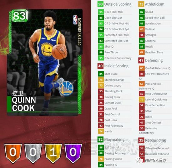 奎因库克在上周对阵篮网的比赛中首发登场,16中11,得到了全队第二高的得分27分,此外他还摘下了3个篮板,送出5个助攻,帮助勇士战胜对手。凭借出色的表现《NBA2K19》为其推出了绿宝石时刻卡,那么这张卡具体数据如何呢?请看下文的《NBA2K19》绿宝石奎因库克时刻卡数据解析吧!