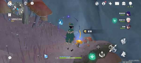 顺着水流前往下图点位,为所有的小蘑菇回复能量,每次回复需要消耗一格能量,能量用光的话可以用开头展示的能量团和发光蘑菇回复哦~