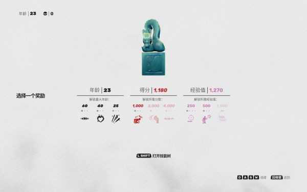 与年龄相关的机制还在于关卡中“神龛”处的“技能购买”*:可以在25岁以前换取武器耐久度、在40岁以前换取复活后的血量值、在60岁之前换取格挡架势条,论重要度其实是格挡架势条>复活血量>武器耐久度,但“时光一去不复返”,所以还是必须要根据单局游戏的形式做出取舍。