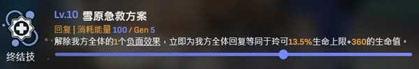 释放战技或者大招时候,会为我方目标获得2回合的持续治疗效果,在角色回合开始时候,会恢复350左右的生命值,若目标有战技的【求生反应】,则额外恢复450左右的血量。