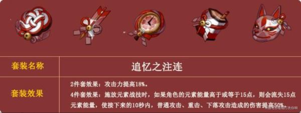 为靠普通攻击来输出的宵宫,追忆套自然是最契合宵宫的圣遗物套装,开启元素战技后普攻能恢复元素能量,足够四件套效果流失的15点元素能力,伤害提升50%持续10秒,元素战技也是持续10秒,完美覆盖,和魔女四件套对比,相对性输出比较稳定,首先推荐,