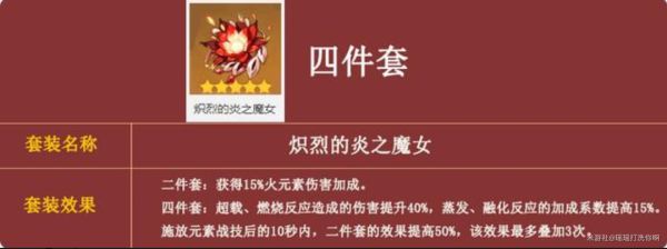 火系角色通用套装,打元素反应可以得到伤害最大化,不过宵宫佩戴四件套只能叠到一层被动,还有就是远程射手角色打元素反应没有近战角色那么稳定,(不推荐这个,相信许多小伙伴曾经在火本没出来过)