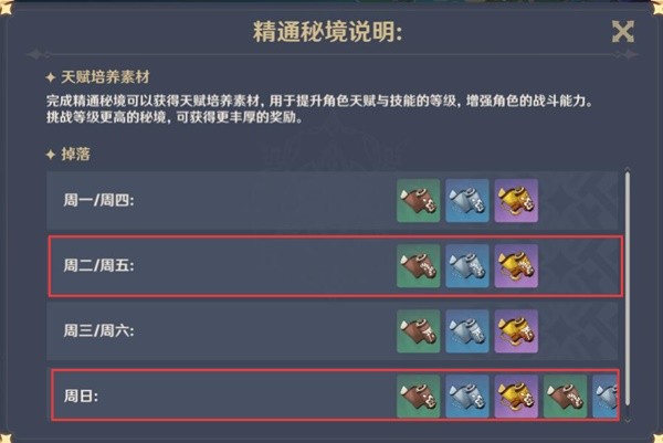 该秘境每日轮换挑战成功后可获得的天赋书类型,其中「风雅」系列天赋书素材仅在每周二/周五 /周日可获得;