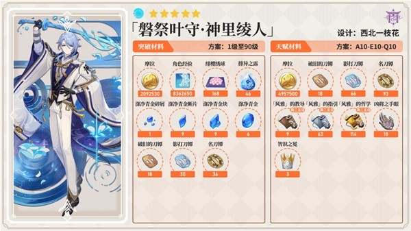 下图展示将神里绫人升级至90级、天赋升级至10/10/10时(未计算命之座加成)所需要的素材数量。