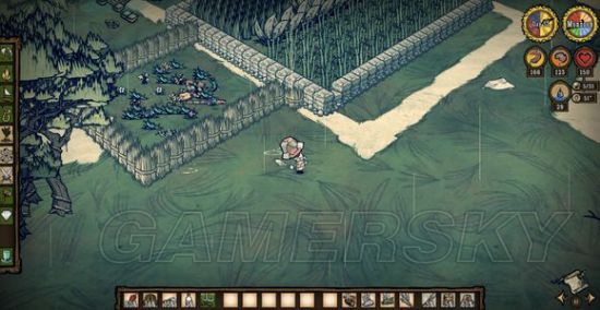 另外要注意,不要离猪人房太近,不然二师兄要和毒蛇闹一闹,虽然不会拆墙,但毒蛇挂了,你还要再刷毒蛇,一来一去很影响效率。这时候就能体现出毒蛇藤蔓的用处了,随时能刷毒蛇,但是jungletree就不能随时能刷蛇。就是这么微妙。