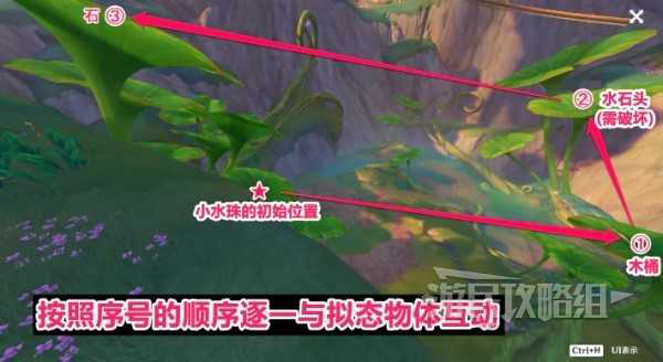 2.对藤蔓石头使用草元素攻击,藤蔓抬起石头后下方会出现小水珠,与其互动开启普通宝箱。