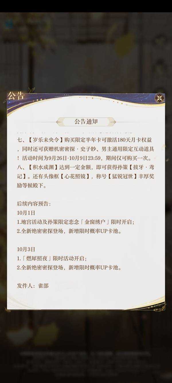 特大重头戏,男主限定剧情(第一期为孙策-金窗绣户),大量天机符传(限定池券),大量养成材料,地宫伴生池至少会有一个小人权,请关注各平台攻略。