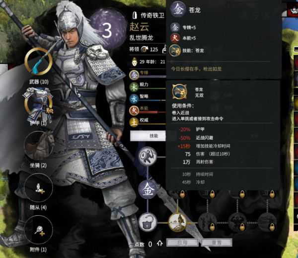 【斗志豪壮】是影响50米的带兵技能,+100%重量对骑兵冲锋至关重要,因此赵云非常适合带骑兵一起冲锋犁地,而且骑兵近战能力也极强。带兵能力比原版大大提升。