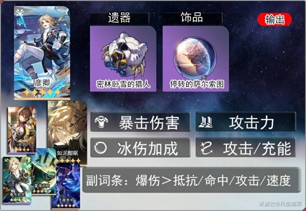 虽然纯堆爆伤加强大招,其实高额的爆伤加上很多加暴击的机制和装备,彦卿的普攻和战技也有不错的伤害。