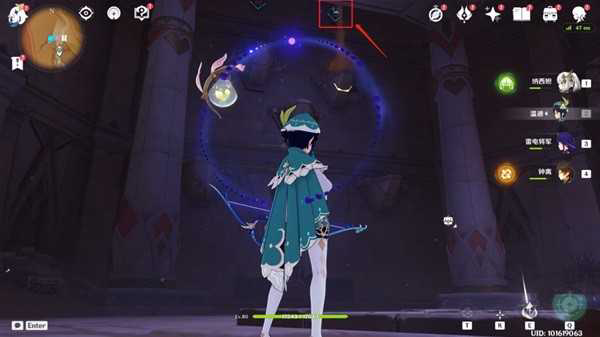 切换出弓箭角色。为了让小伙伴们保持统一,我们先用弓箭角色的蓄力攻击将沙池上的蓝色光点熄灭。
