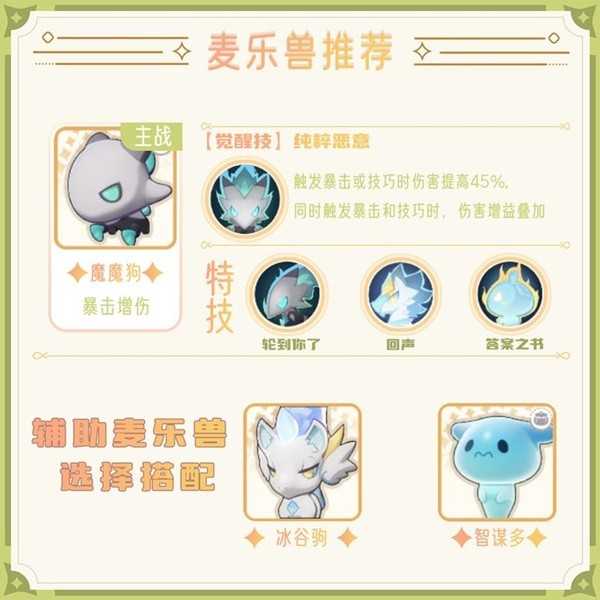 麦乐兽选择“魔魔狗”魔魔狗的暴击增伤收益对输出来说非常巨大,特技方面除了自带特技外就是推荐冰谷驹和智谋多的“回声/答案之书”这两个携带的特技一个有着距离增伤,另一个则可以随机为我们提高属性,对于游侠这样的远程输出是非常需要的。