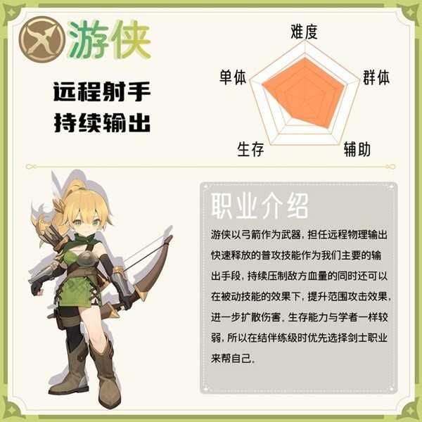 游侠以弓箭作为武器,担任远程物理输出。快速释放的普攻技能是我们主要的输出手段,持续压制敌方血量的同时还可以在被动技能的加成下,提升范围攻击效果,进一步扩散伤害。但因为生存能力较弱,比较依靠剑士的保护,不过值得一提的是游侠的输出能力处于前列,喜欢玩远程输出的玩家可以优先选择。