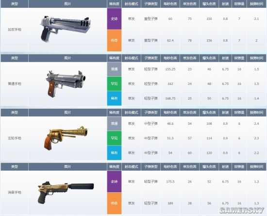 加农手枪、普通手枪、左轮手枪、消音手枪