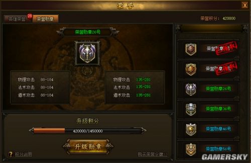 当玩家的荣誉积分达到满值时,即可通过升级勋章按钮来进行勋章升级操作;