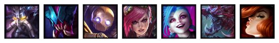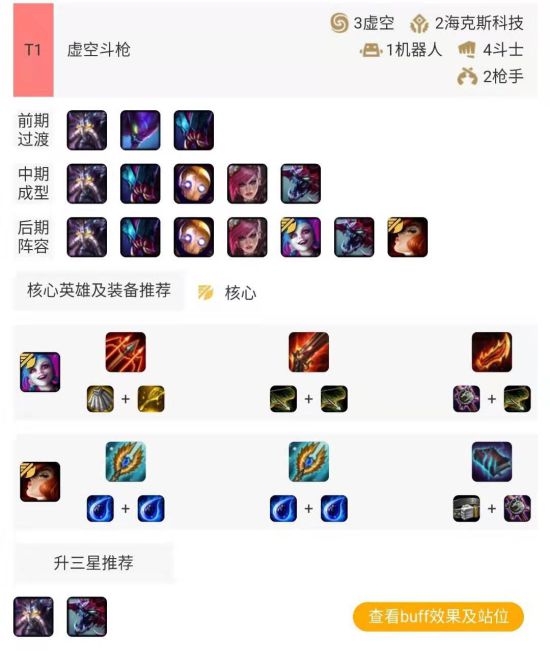 前期使用三虚空进行过渡,中期加入蔚与大虫子触发四斗士羁绊,随后加入核心英雄金克丝,并在后期加入女枪搭配金克丝触发双枪手羁绊并提供AOE伤害。