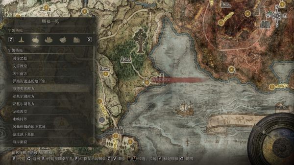 1.打开地图,按F可以打开赐福列表,类似于只狼的坐佛点,但是这个界面就友好很多了;按Y也可以显示地底地图,在后续开了安瑟尔河支流和安瑟尔河主流的时候,就可以直接在主界面来看了;按E可以放置光柱,和吃鸡的打标记一样;按R可以放自定义标识,有些地方白天平平无奇但是晚上有BOSS,有些地方有传送门宝箱,可以做标记以免遗漏