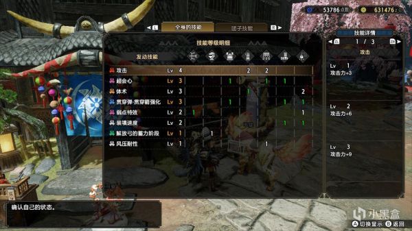 根据伤害计算,从体术3耐回2、通常弹强化3、弱点特效3、属性强化5、强弓的基础上,多余的二级孔依次添加的技能如下。所有配装伤害差距都不大,不想麻烦的随意选择也没问题。