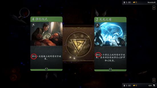 净化(Purge),类似炉石中的词缀沉默,但是区别还是存在的。净化就是清除所有临时效果和修改效果。不会净化来自其他单位的光环效果,不会净化掉基础效果,比如说自带被动或者装备带来的效果。必须注意的是,净化本身的关键词是可以净化无论来自己方还是敌方的所有效果,但是目前的两张净化卡都是只能驱散敌方的效果,比如修改血量,修改减己方单位护甲等。