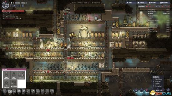 整个游戏就是在和氧气作斗争。我自己玩下来还是感觉电解水机器不要太快研究,会很耗水。不要选择初期的Algae Deoxydizer,效率太低,研究好第一个科技以后用Terrarium制氧,初期大概7-8个制氧包,虽然会一直提示你氧气入不敷出,但是因为原本洞里也会有氧气。按F1看一下,要是洞里全都变成深蓝色,小人头上出现氧气需求了,就说明制氧不太够了,那个时候你的电解水科技肯定也出来了,再造也来得及。