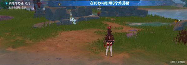 15秒引爆3个炸药桶,难的的瞄准,可以在图中这个位置先放一个安柏玩偶,再开启挑战。或者用大剑角色冲过去打爆。