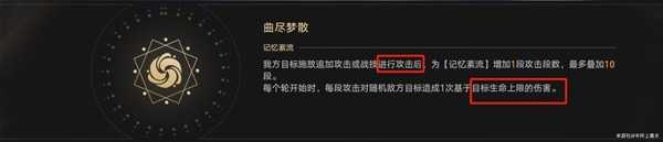 本期关卡BUFF曲尽梦散效果是追加攻击和战技攻击之后叠加一层记忆紊流层数,需要注意战技只有攻击才算,同谐和奶妈的战技释放未造成敌方伤害是不能叠加的;