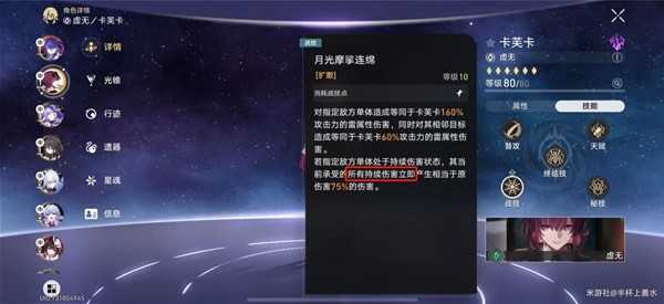 由于卡芙卡行动之前恐龙身上有【奥迹】状态,卡芙卡自身攻击+1层,引爆【奥迹】+1层,专武游丝添加负面状态+1,因此卡芙卡释放战技之后【炉灶加温】会增加3层;