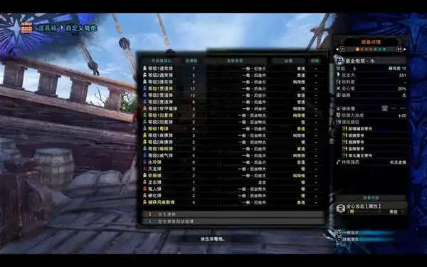 推荐的装备技能:复合珠顺带的精灵加护或整备;防御性能1、3、5;投射器装填数强化1,怪物倒地能更好地使用机关龙弹。
