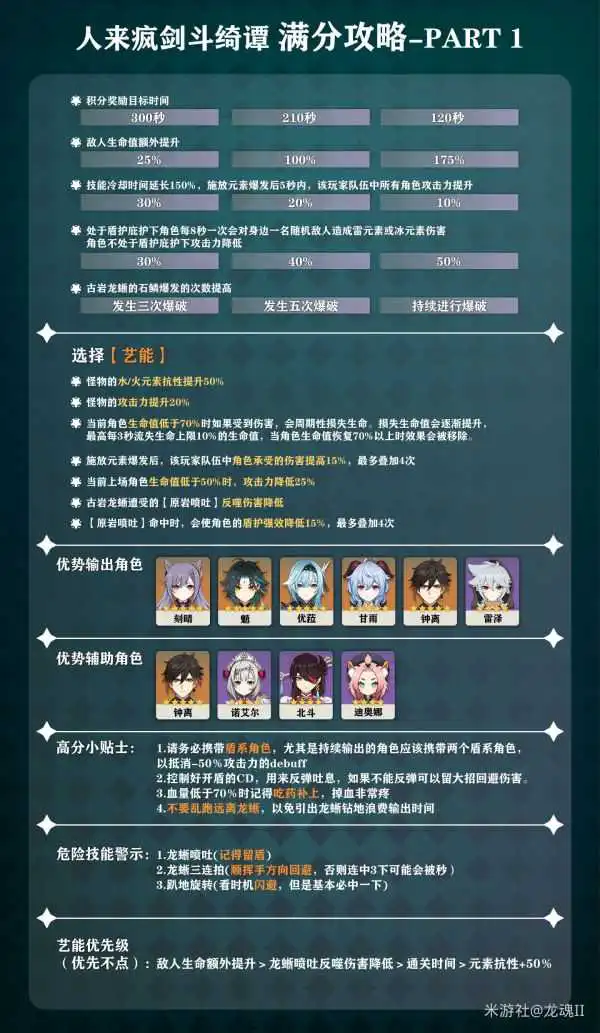本期总的来说有点接近于第一次无相活动的那种难度感觉了。主要是CD+150%这种天才buff也不知道是谁想出来了。那么我们也有办法,就是使用不需要技能的角色就好了(一如既往的物理系大胜利),此外就是因为无盾状态下会-50%的攻击力,这个debuff没几个角色能受得了,所以尽量保持角色一直有盾。因为+CD的原因,如果是持续输出角色的话为了保证输出的持续性最好带两个盾系角色轮流补盾,然后剩下的就是注意一下主要的致死技能就可以了。此外如果不勾选龙蜥吐息反噬伤害降低buff的情况下,还可以使用盾反流这一逃课打法(后续视频会说到)。那么攻略整理如下。