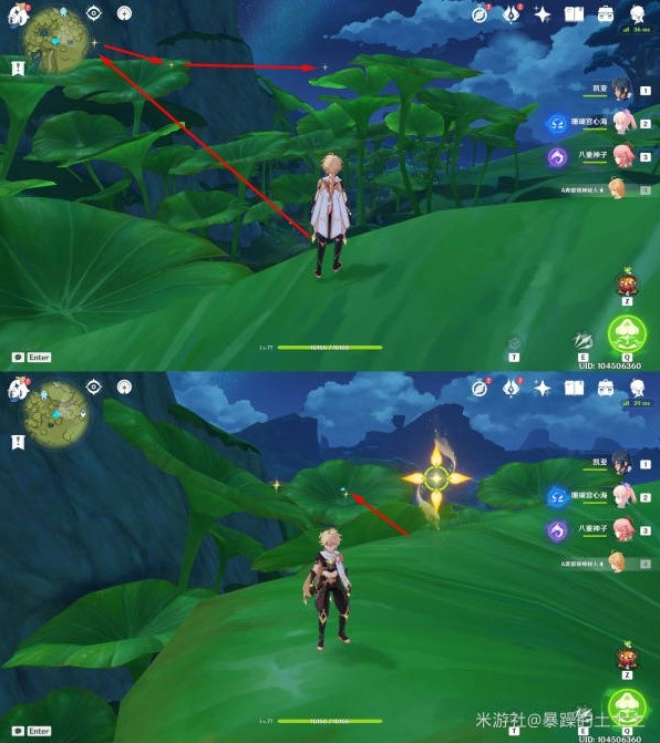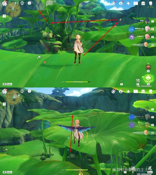 ②③传送到水天丛林右下角锚点,从北方向跳到下一层平台,②在花丛后,然后在旁边激活众叶觉蕊,利用四叶印飞到对面的树的平台找到③。