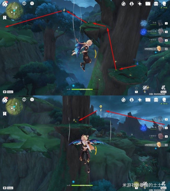 ②用雷元素激活隐藏的事物,然后利用弹弹菇跳到高空,转用四叶印拿到最高处的神瞳。