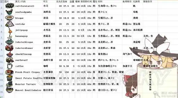 这里就还是借用一下逆光曾现的食谱图了,可以方便大家看一下海难专属料理的基本属性,后面主要介绍几样性价比高且比较实用的料理。(后四样是大厨红色的烹饪锅专属的料理)