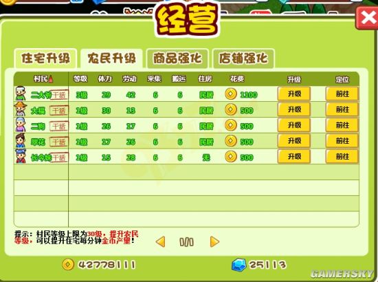 除了上述的基础属性外,农民还有成长属性,等级越高资质越好的农民能够干更多的活才去休息。玩家招募到农民后,农民会自动开启干活模式。如果你发现有些农民不干活的话,可以打开“经营”操作面板,选择“农民升级”栏目。在村长征战团经营活动这里,玩家可以查看到所有农民的状态,如果是在干活状态的话,农民后面会有“干活”的红色标签。