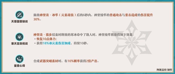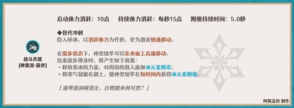 ②.固有天赋2:神里流·霰步(特殊冲刺)的启动消耗10点体力,而该天赋将回复10点体力,使得该冰伤加成可以长时间保持。该冰伤加成计入角色面板中,通常需要冲刺结束后施放元素爆发“锁住”该冰伤加成。