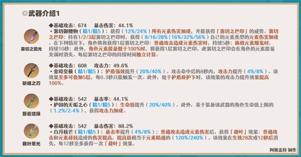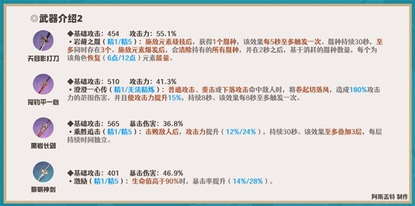 ⑥.此外还可以考虑其他非5星副属性为暴击伤害、百分比攻击的武器,如笼钓平一心、黑岩长剑、黎明神剑、笛剑等。