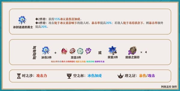 ①.神里绫华的圣遗物套装优先考虑冰封迷途的勇士(冰套)4件,更多搭配水元素角色触发冻结反应,可以更好的获得特定条件下的攻击暴击率提升。